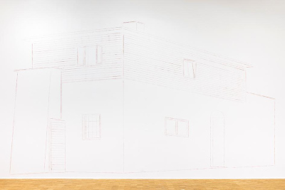 Tatiana Lecomtes fotografische Projekte geben eine eminent politische Leseweise vor, beziehen sich auf Fragen der Repräsentation, der Rolle des fotografischen Bildes als Teil eines Regimes der Sichtbarkeit und auf die Art und Weise, wie Fotografie in die Herstellung von Geschichte verstrickt ist. So auch in ihrem Projekt Gott segne das Jahr 1942. Helene Taussig und ihr Haus: Ihre an die Wand des Salzburger Kunstvereins mithilfe einer Schlagschnur (1) übertragene Zeichnung des Atelierhauses von Helene Taussig in Anif basiert auf einer Fotografie aus dem Jahr 1935. Das Haus in Anif, welches sie 1934 in atemberaubend modernem Stil für sich bauen ließ, verkörpert die letzte Lebenswelt der Helene Taussig.